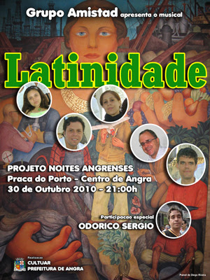 Devido às obras que estão sendo realizadas na Casa da Cultura e no Centro Cultural Theóphilo Massad, nosso musical Latinidade terá sua estreia na Praça do Porto, dentro da programação do Projeto Noites Angrenses neste sábado (30/10) às 21h. Algumas modificações tiveram que ser feitas para adaptar o musical a uma apresentação ao ar livre, mas o resultado deverá agradar em cheio àqueles que gostam da boa e velha musica latino-americana, além é claro, de Música Popular Basileira. A grande novidade na última semana de preparação foi a confirmação da participação do Maestro Moacir Saraiva que se junta a Odorico Sérgio para dar muito mais "glamour" ao espetáculo. Esperamos todos vocês lá!
